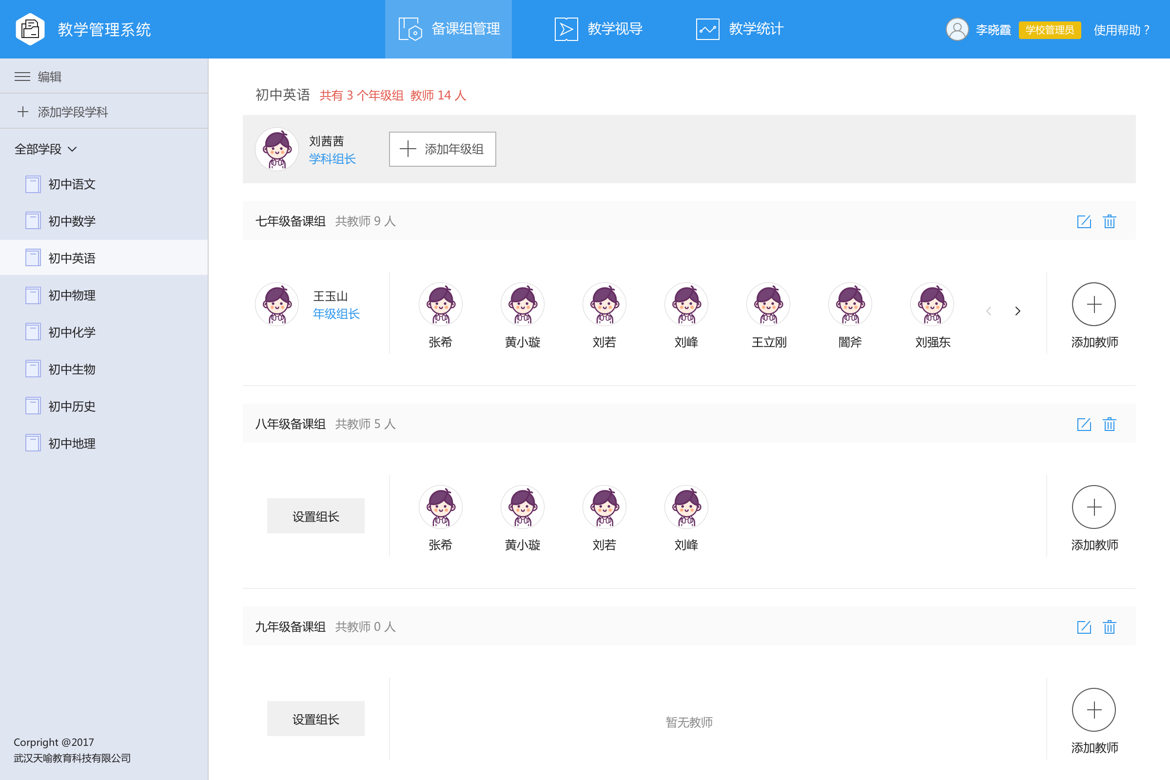 通过教研、学校、老师,构建一体化教学管理体系,以教研体系为主导,以学校管理为抓手,以备课任务为驱动,规范教师教学行为。为了便于精细化管理,要为不同身份指定不同管理角色,提供不同管理功能。